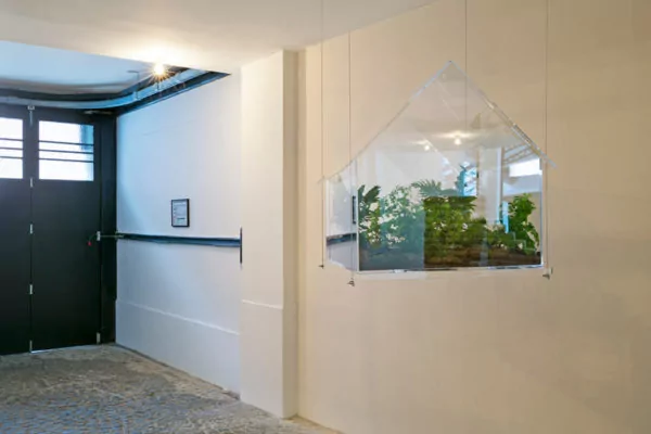 Offering the visitor an intimacy with nature, Vaughn Bell’s Village Green is set up like “personal biosphere”. This plexiglass structures takes the form of a house invaded by native plants, always sourced from the indigenous varieties location where the work is presented. The visitors are invited to place their heads within the structure for a sensory immersive experience of the scent and touch of the plants and soil, as a cure for contemporary urban life, infected with concrete landscapes, WIFI radiation and diesel fumes.