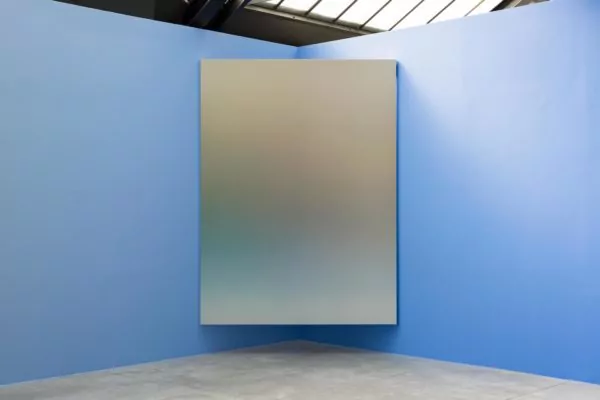 The installation commissioned for this exhibition deploys itself into a long gradient of color over 24 meters. In tension with the architecture, three surfaces coexist: an angled mural interspersed with a large canvas. The boundaries between the immaterial and the tangible, between space and time, become blurred. The artist pushes the limits of painting and his work is distinguished by an intense experience of the conditions of visuality. His laborious process, despite the concealment of the gesture, is at the service of a refined content and a heightened tension between the prosaic and the sublime.