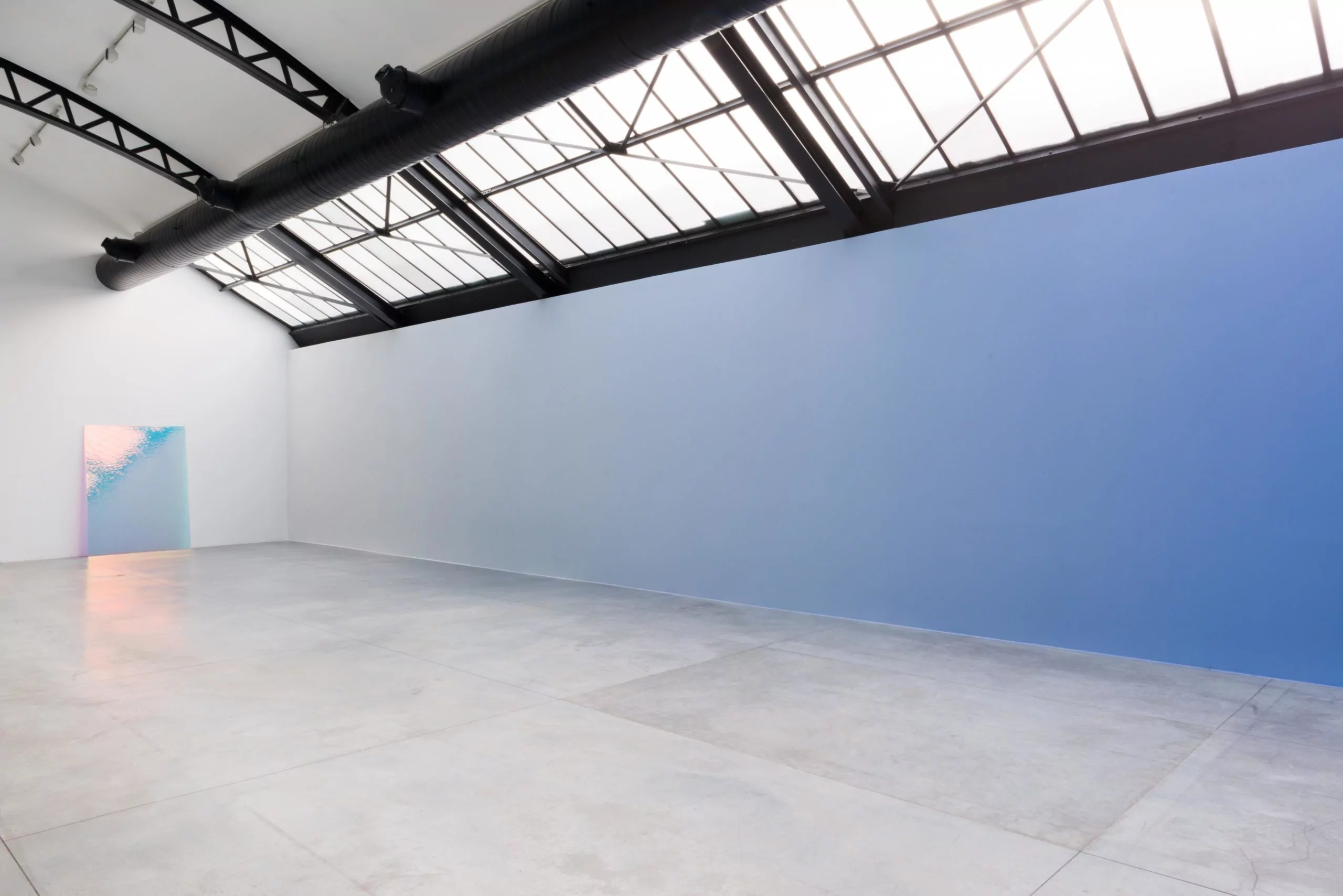A change in physicality occurs when we look towards the end of the perspective. A close relationship is induced with works which are deepening while we approach them. The spatially vibrant painting of Irma Blank (b. 1934, lives and works in Milan) captivates us, before revealing a linear gesture filled with serenity. Through the variations in colour intensity, the rhythmic duration of her breathing acquires materiality and legibility. By sliding into the secluded space reflecting zenithal light the most, this same meditative and haptic constancy manifests itself in the installation by Nadia Guerroui (b. 1988, lives and works in Brussels). Here we explore the elusive nature of her iridescently coloured wall surface, which also changes in time, depending on the position of the sun.