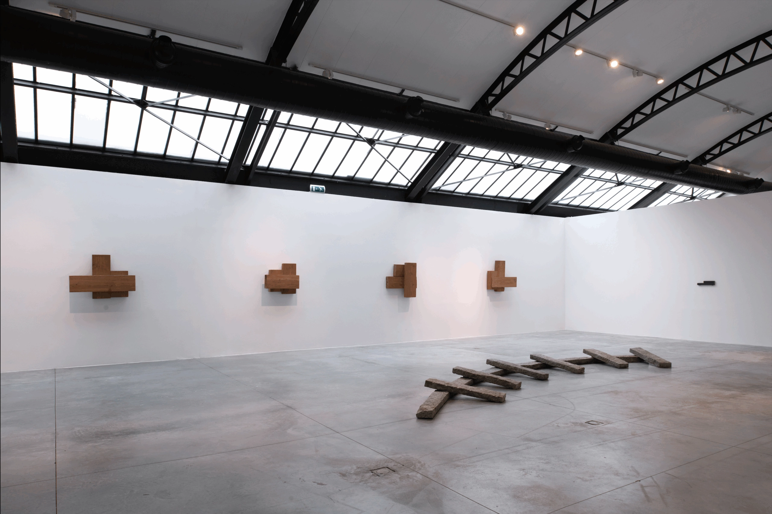 Among the highlights of the exhibition are works in wood that stretch across the walls of the Foundation, creating a tension between emptiness and volume. Blocks of stone laid out on the floor, inviting visitors to redefine their path through the space, and more intimate works on paper.