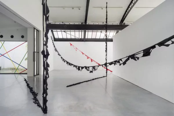 Marion Baruch (°1929Timișoara, Romania), een onlangs herontdekte kunstenares die sinds de jaren 1950 schilderkunst, beeldhouwkunst, installaties, performances en collectieve creatie combineert, heeft op 80-jarige leeftijd een nieuwe creatieve wending genomen. Sinds 2009 is zij geïnteresseerd in het restmateriaal en het afval van de textielindustrie. Tegenover overconsumptie en buitensporige exploitatie van grondstoffen, suggereert Baruch een soepele en variabele geometrie, ten behoeve van herwaardering. Haar gevonden materialen worden zorgvuldig geselecteerd; meestal monochroom, altijd flexibel, en worden vervolgens eenvoudigweg aan de muur of aan het plafond opgehangen. Sommige installaties strekken zich weids uit: de Trajectories structureren en belemmeren tevens de ruimte die hen ontvangt: door een alternerend spel van holtes en volumes, genereren deze werken een haast incidentele schoonheid.