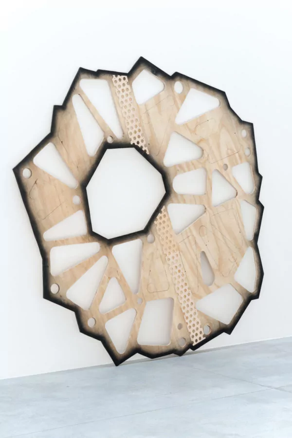 Tijdens zijn residentie bij Fondation CAB, produceerde John Tremblay verschillende werken die deel uitmaken van Alentour. Zijn kenmerkende “squircle”-vormen (naar analogie met een vierkant en een cirkel) verschijnen als een frisse variant op de harde hoeken, strakke vlakken en rechthoekige vormen die doorgaans de Geometrische Abstractie bepalen. Hij werkt met zeefdruk, afgevlakt schrootmateriaal en hout, en beschouwt zijn werkproces daarbij als dat van een tekenaar: zo tekent hij met een cirkelzaag in houtpanelen, om ze vervolgens af te werken met eenvoudige verf. Zijn werken vibreren een bepaalde energie die sterk doet denken aan microscopische celvorming, en daarmee het soms scherpe en statische rationalisme van abstractie doordrenkt met een levendig ritme en wervelende bewegingen. De ervaring van zijn werk impliceert een verwarring, met name over het vooropgestelde idee van minimalistische kunst. Zijn handmatige productieproces staat haaks op de industrieel geproduceerde werken die zo eigen zijn aan het minimalisme; rigide patronen worden afgebroken door organisch ogende metalen oppervlakten; het werk bevraagt het spanningsveld tussen standaardisatie en uniciteit.