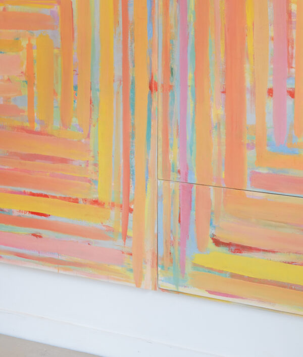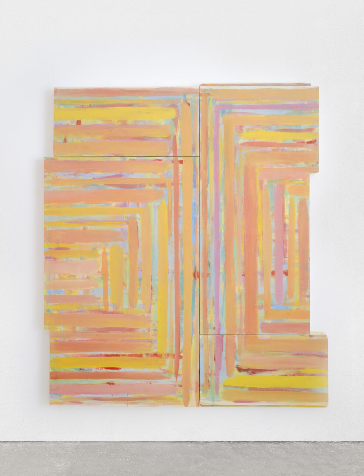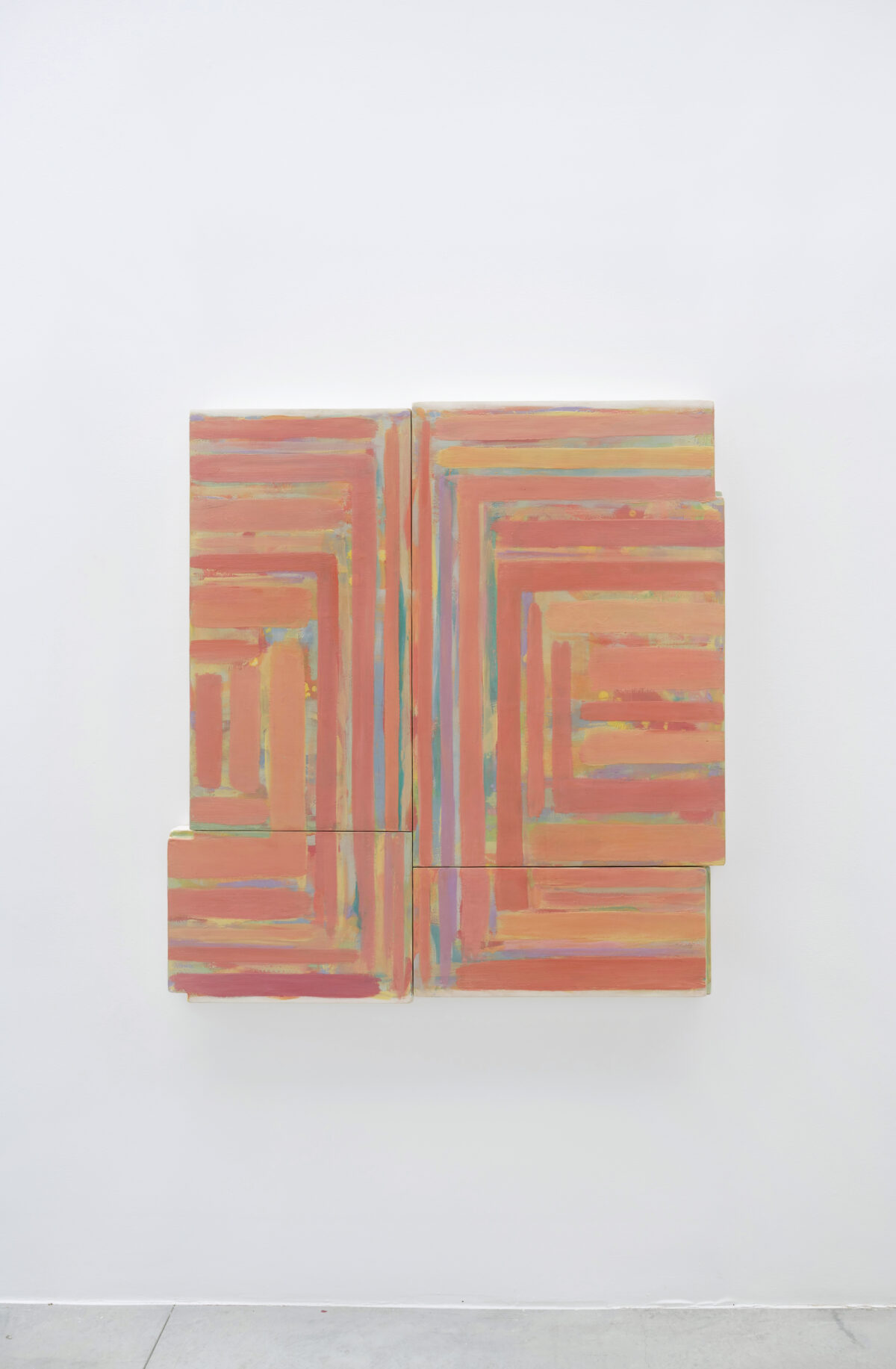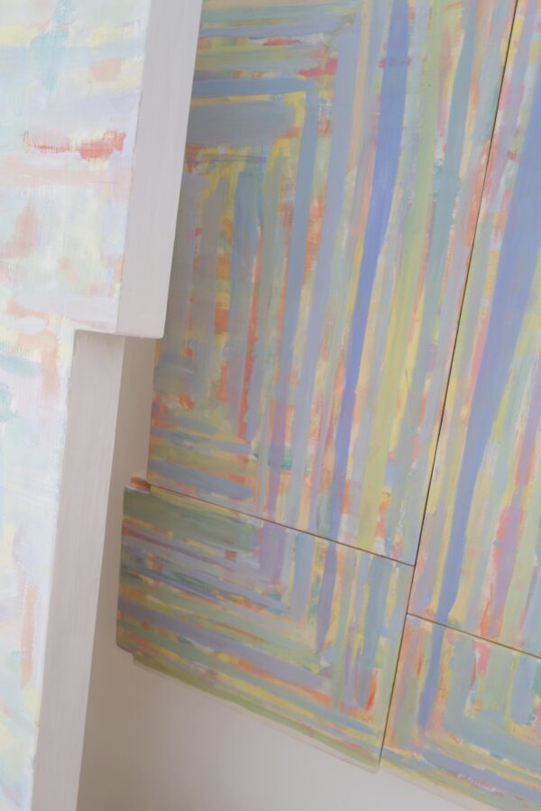 The vertical installation of his objects evokes an architectural heritage, despite being crafted solely for observation, they possess an inherent capacity to transcend functional constraints, inviting the viewer to explore concepts of entrance, access, and exit. Traditionally associated with functionality, these ideas transform into metaphors through the viewer’s shared experiences. This notion of portals, coupled with the imagined ability to peer beyond the picture, becomes the main element of engagement provoking contemplation on configuration, composition, color, and materials.