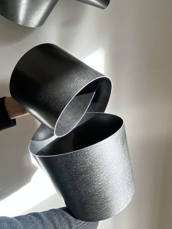 These shimmery sheets are then folded and layered to form structures that appear to be composed of welded metal as opposed to pencil and paper, often engaging directly with the architecture where they are shown.
