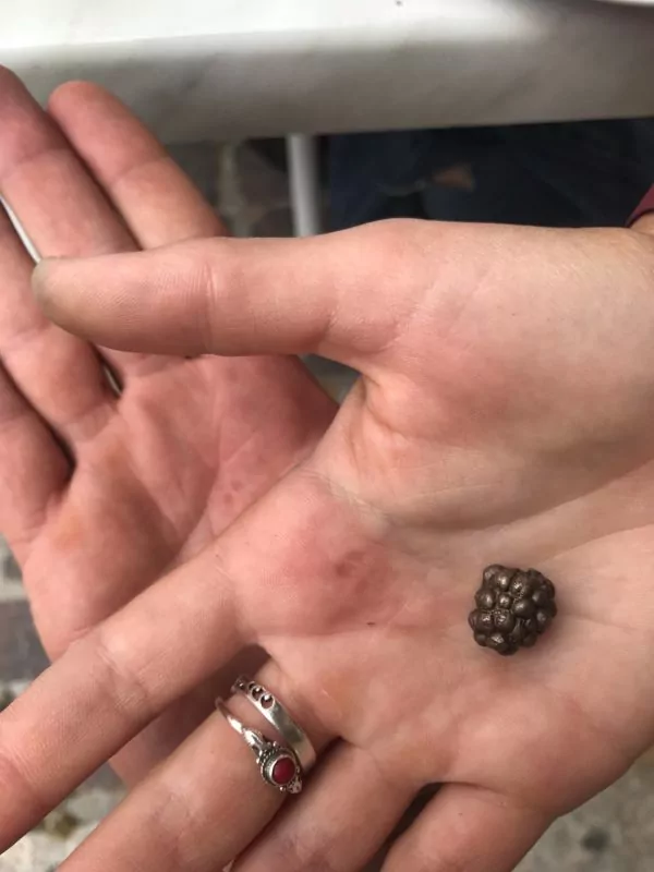 On the 22nd of April 2023 there was a conversation in the exhibition Worldlines between Fabiola Burgos Labra (b. 1989 Chili) and me. Fabiola pressed a casted bronze blackberry between her hand and mine, while telling the story of how the fruit was imported to create “natural” barriers in her motherland Chile. When our hands parted, it left a small impression of the fruit as a trace of herstory. Ways to Return Home, the title of the piece, will be brought along the walk.