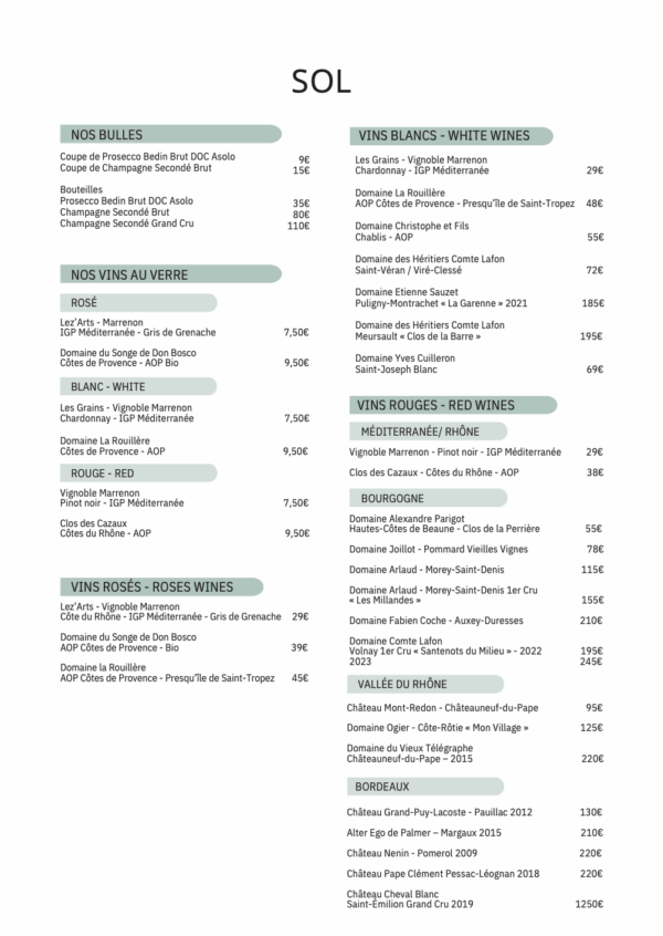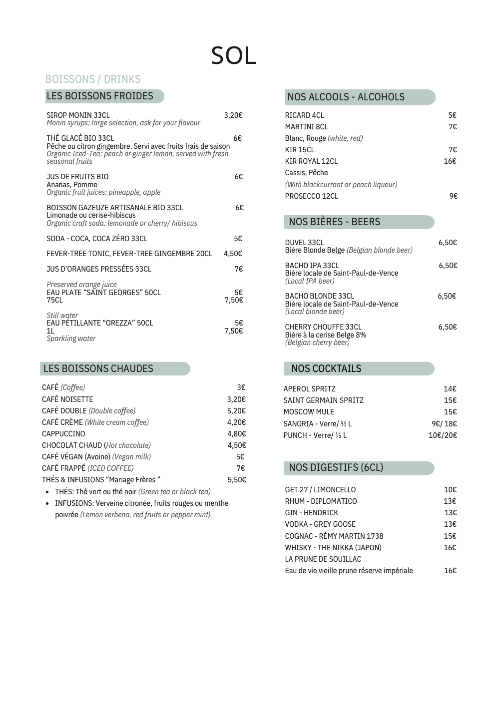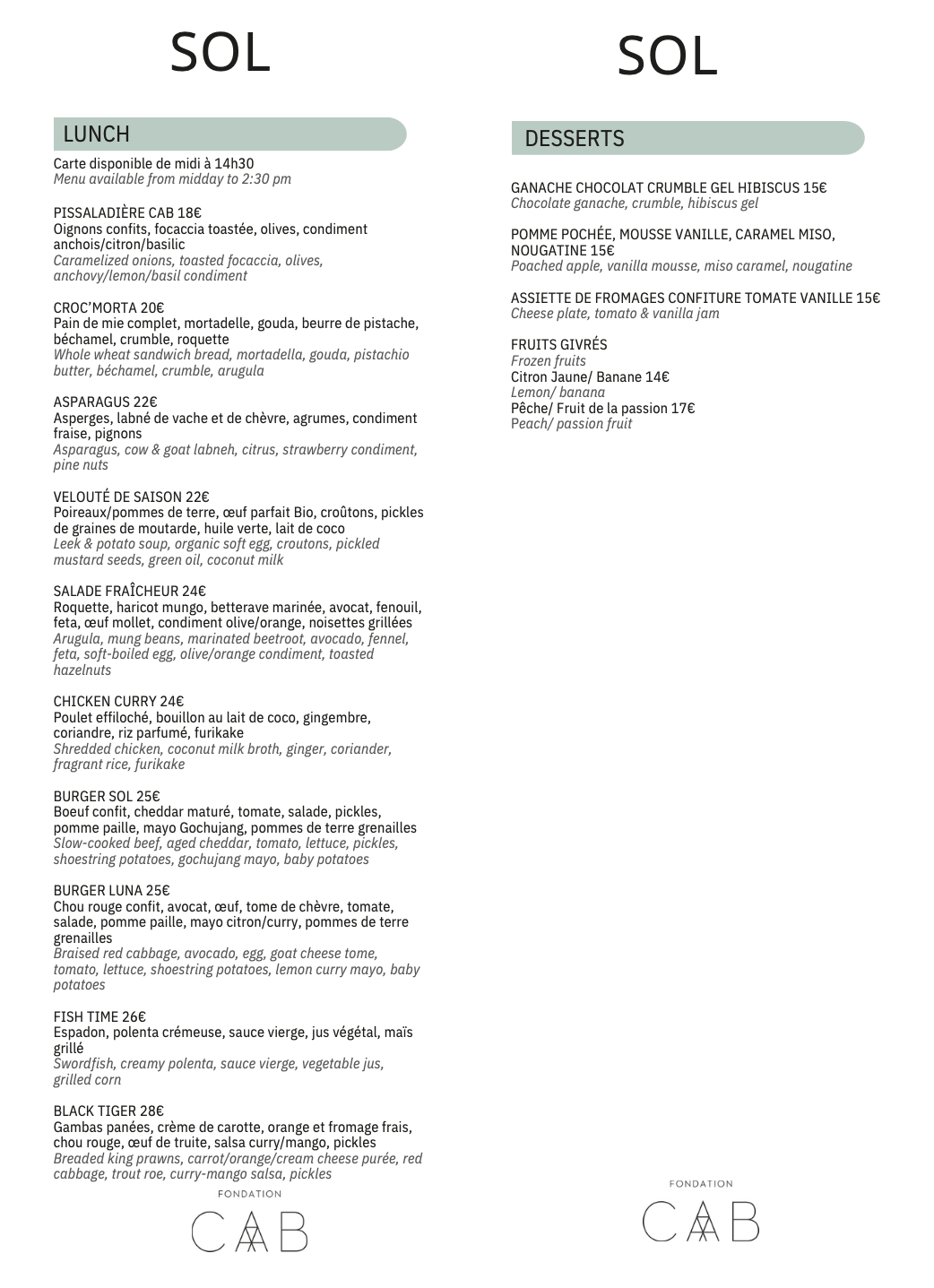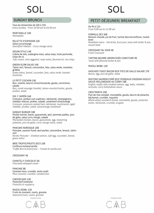 The café-restaurant SOL invites its guests to discover a tasty menu within the Fondation CAB. The sober and uncluttered menu highlights local seasonal products.